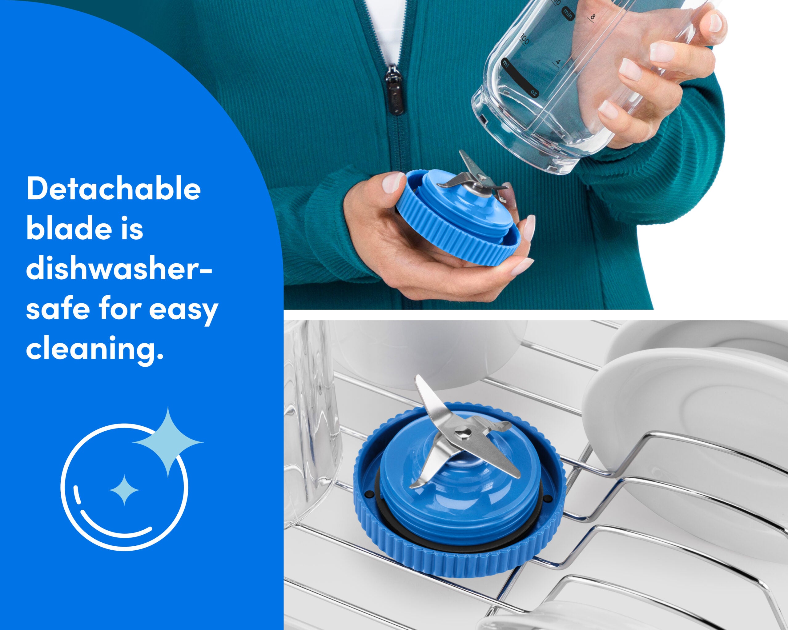 Dishwasher-friendly blade. Silicone charge port cover prevents liquid damage.
