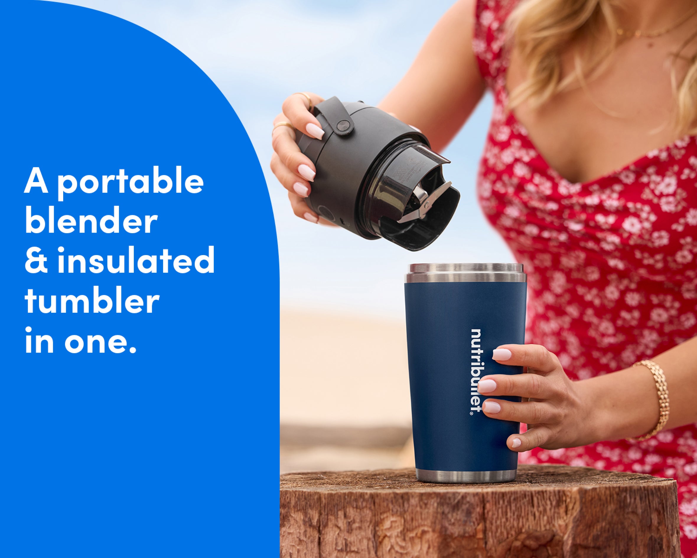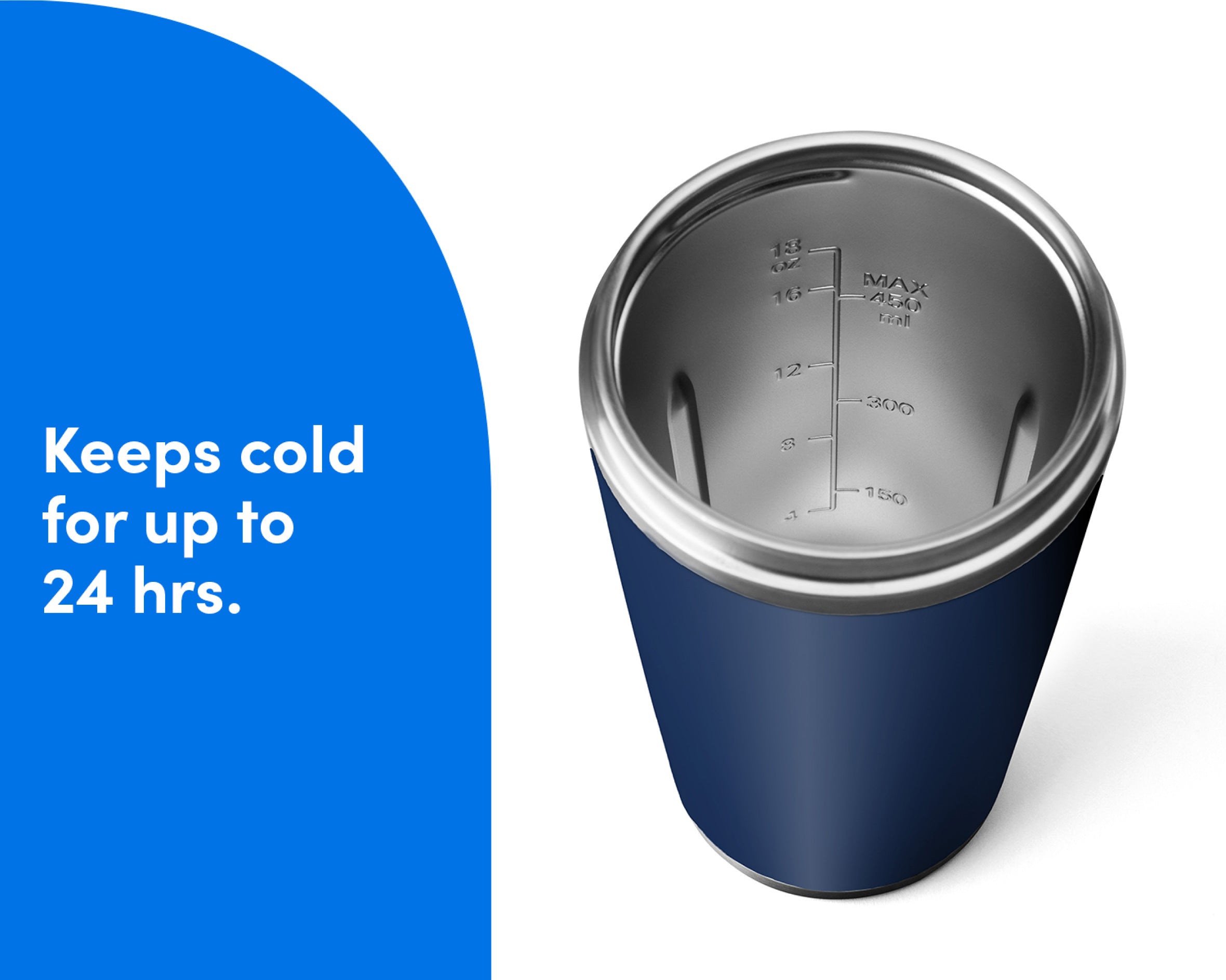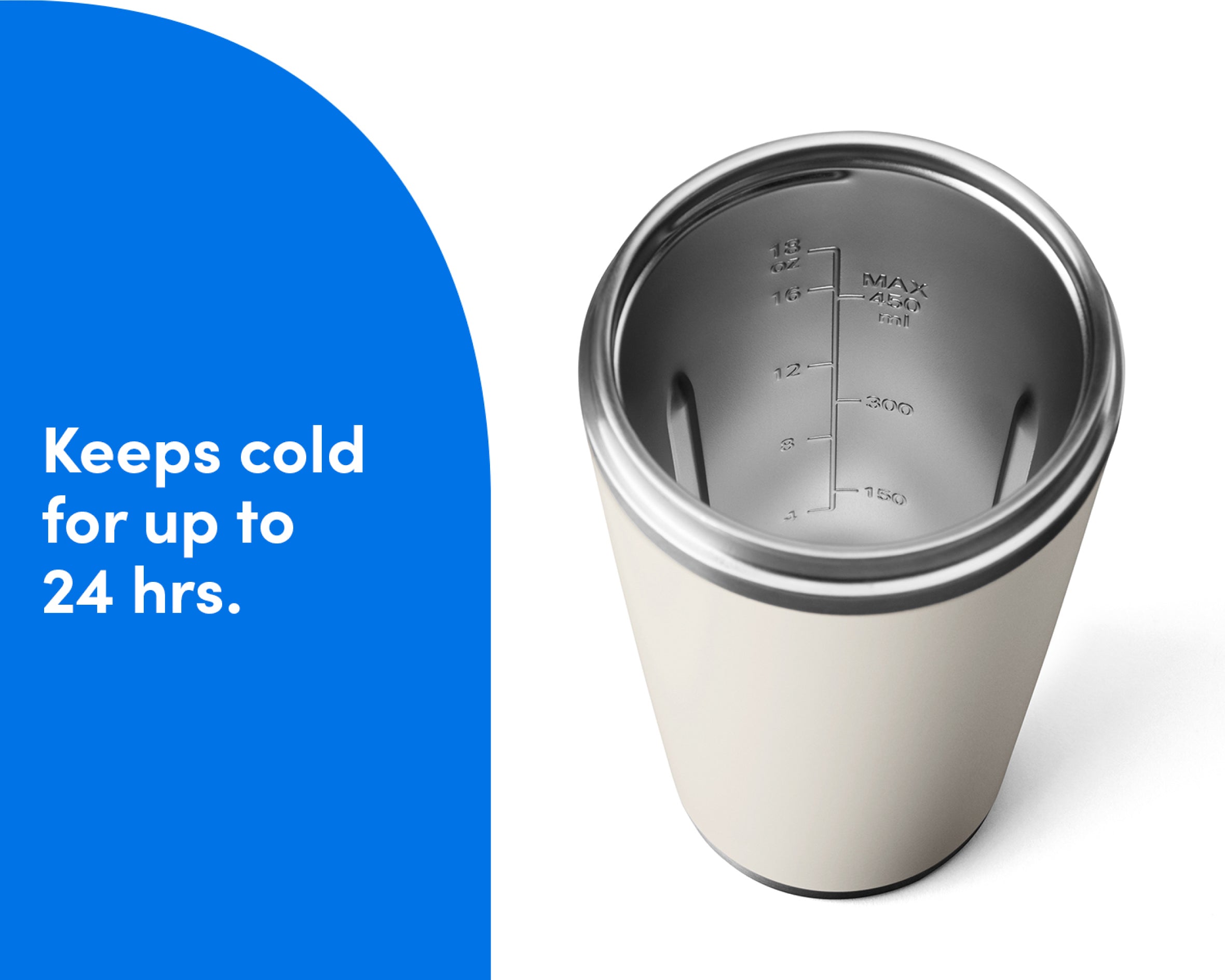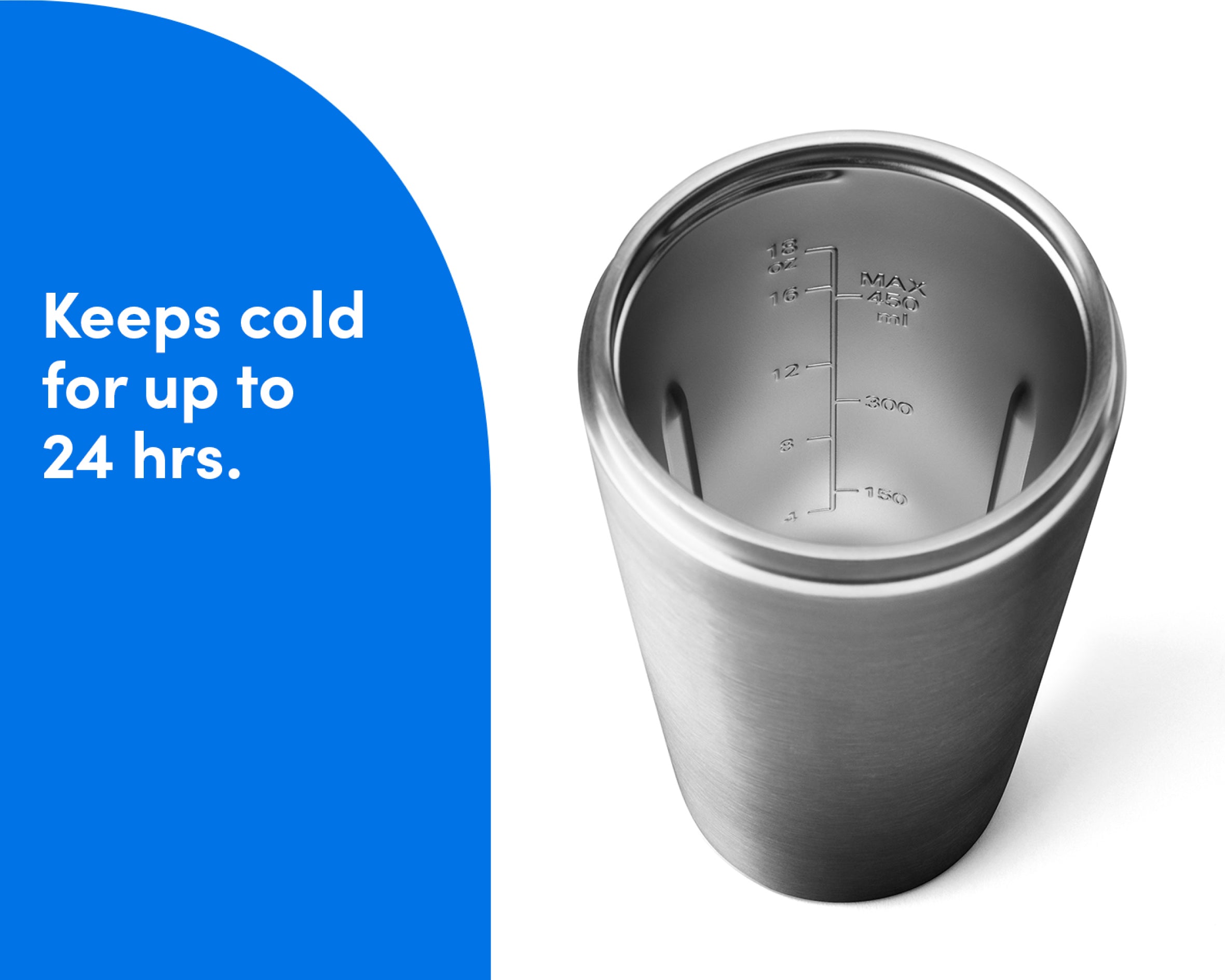 The stainless steel tumbler keeps blends cold up to 24 hours.