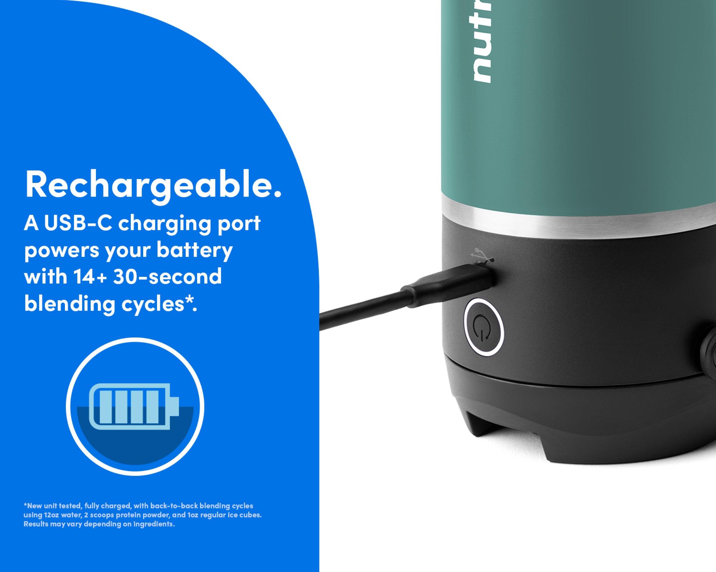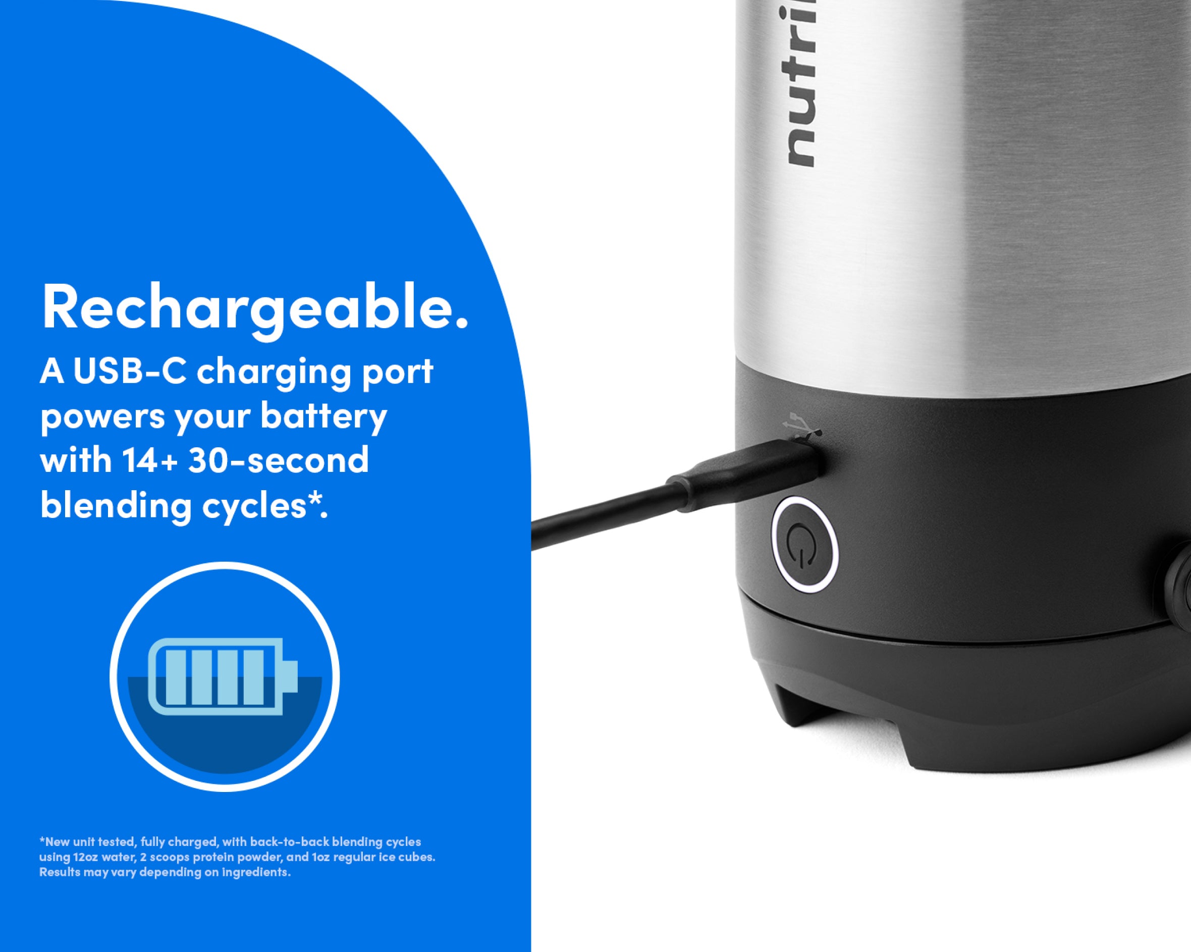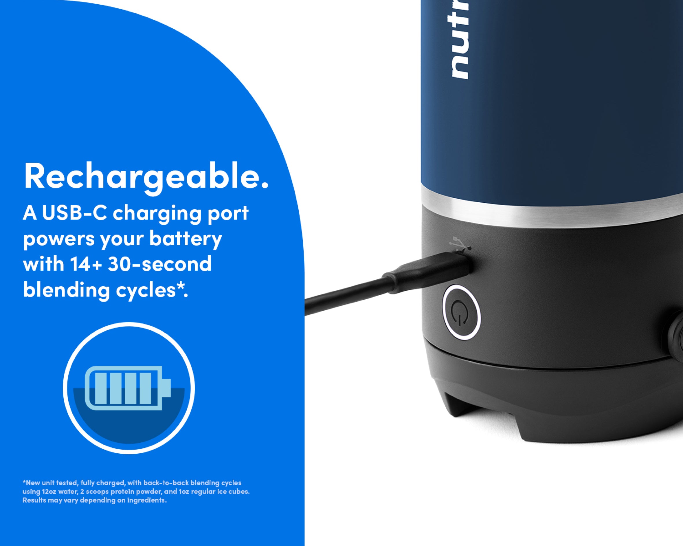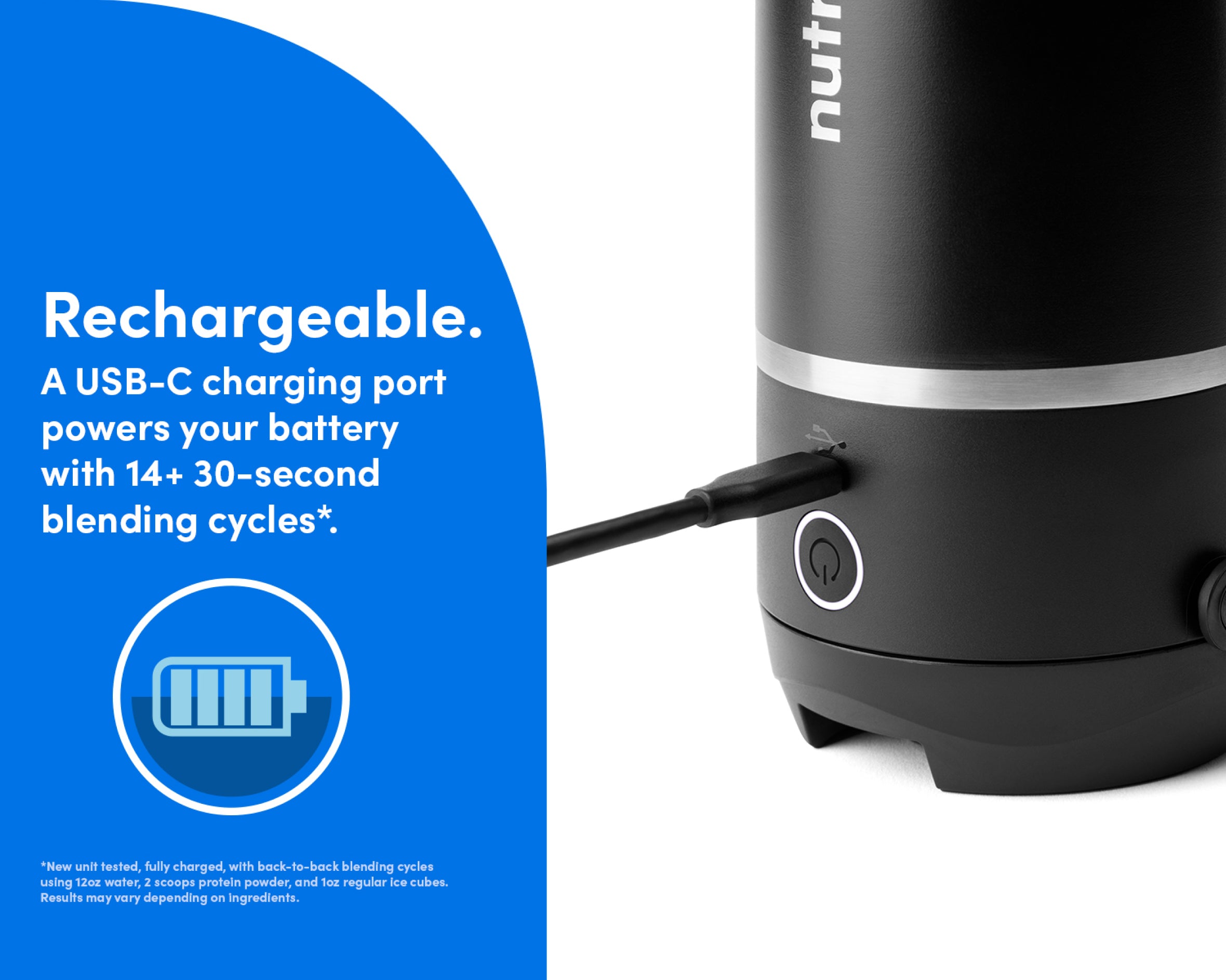 A USB-C charging port juices your battery with 14+ 30-second blending cycles per full charge.**
