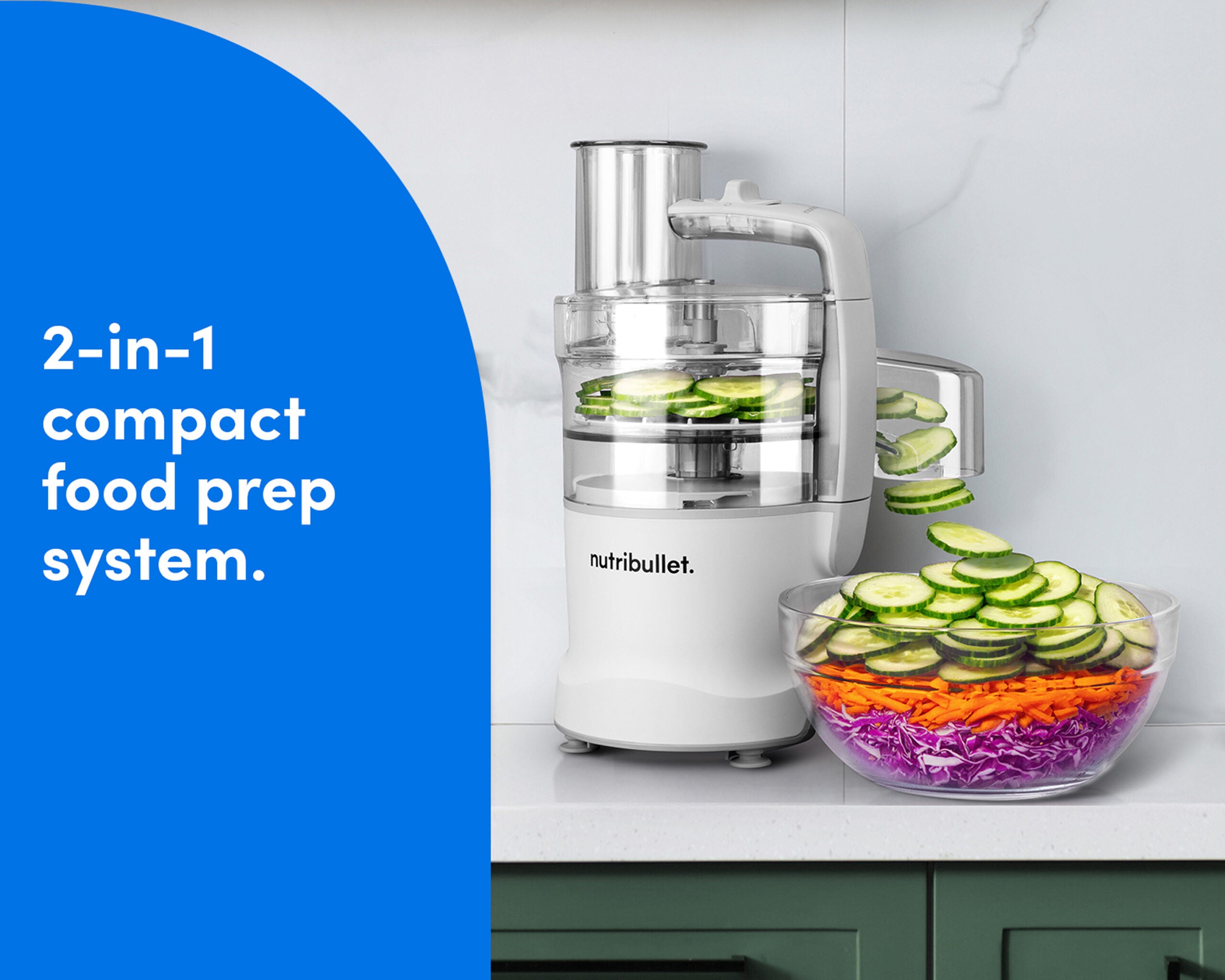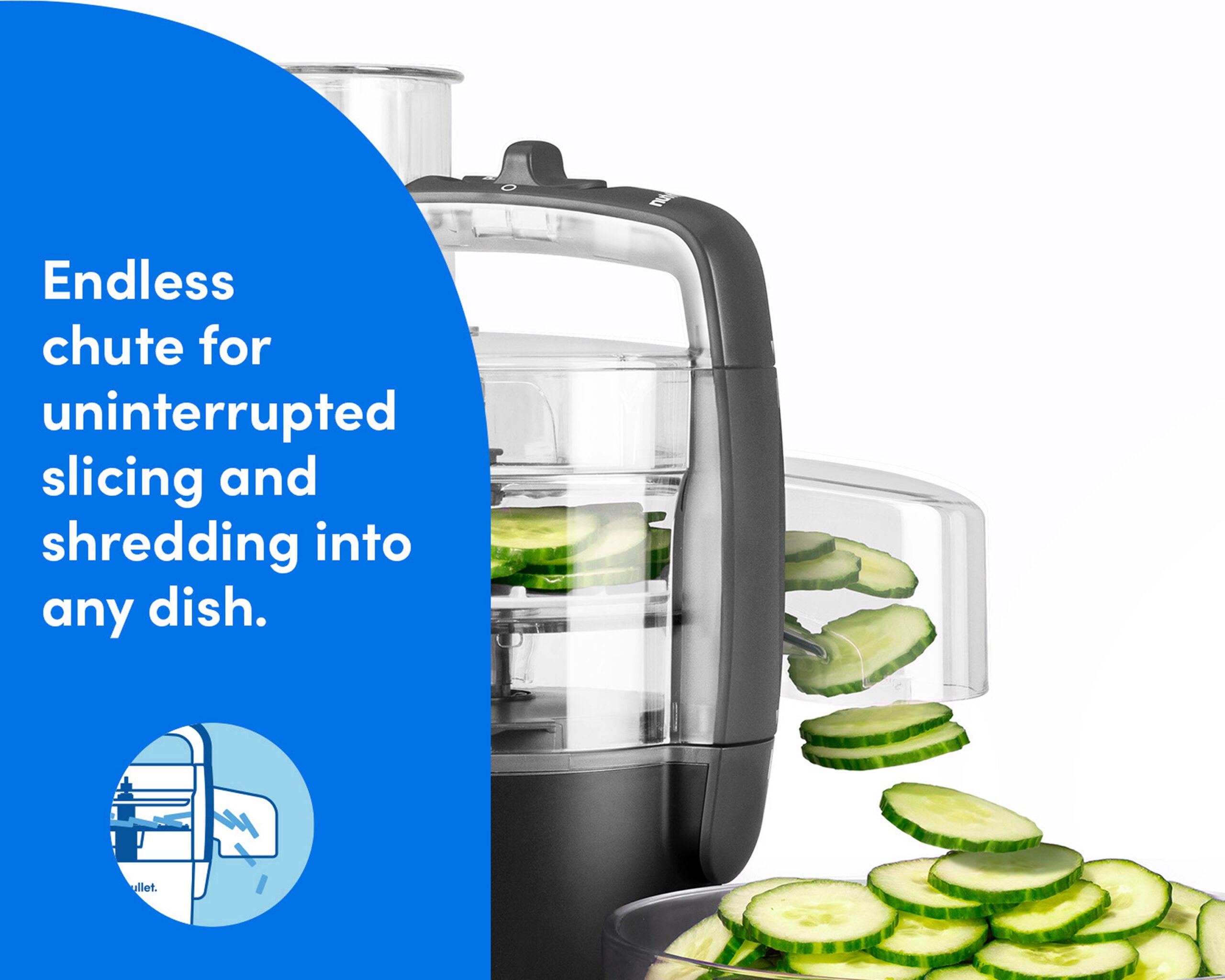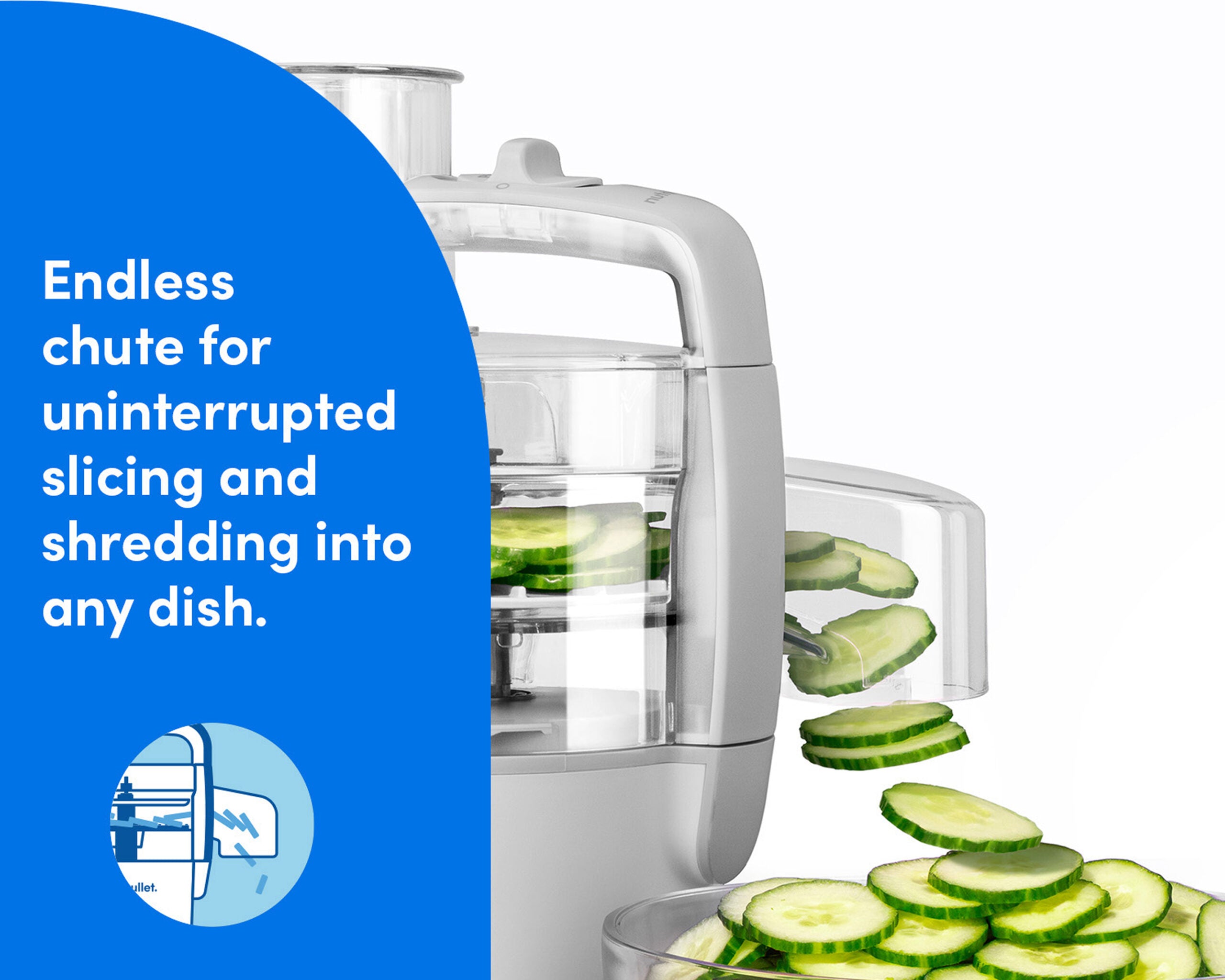 Slice, shred, and chop in seconds with this compact food processor, designed with innovative features that save space while speeding up prep. Make purees, dips, and sauces in the 5 ½-cup Work Bowl, or tackle high-volume slicing and shredding with the Endless Chute, which lets you process large batches into an external dish. Its simple toggle control offers continuous and pulse options, while dishwasher-safe components make cleanup a breeze. And when prep is over, all parts stack neatly inside the unit for tidy, efficient storage.