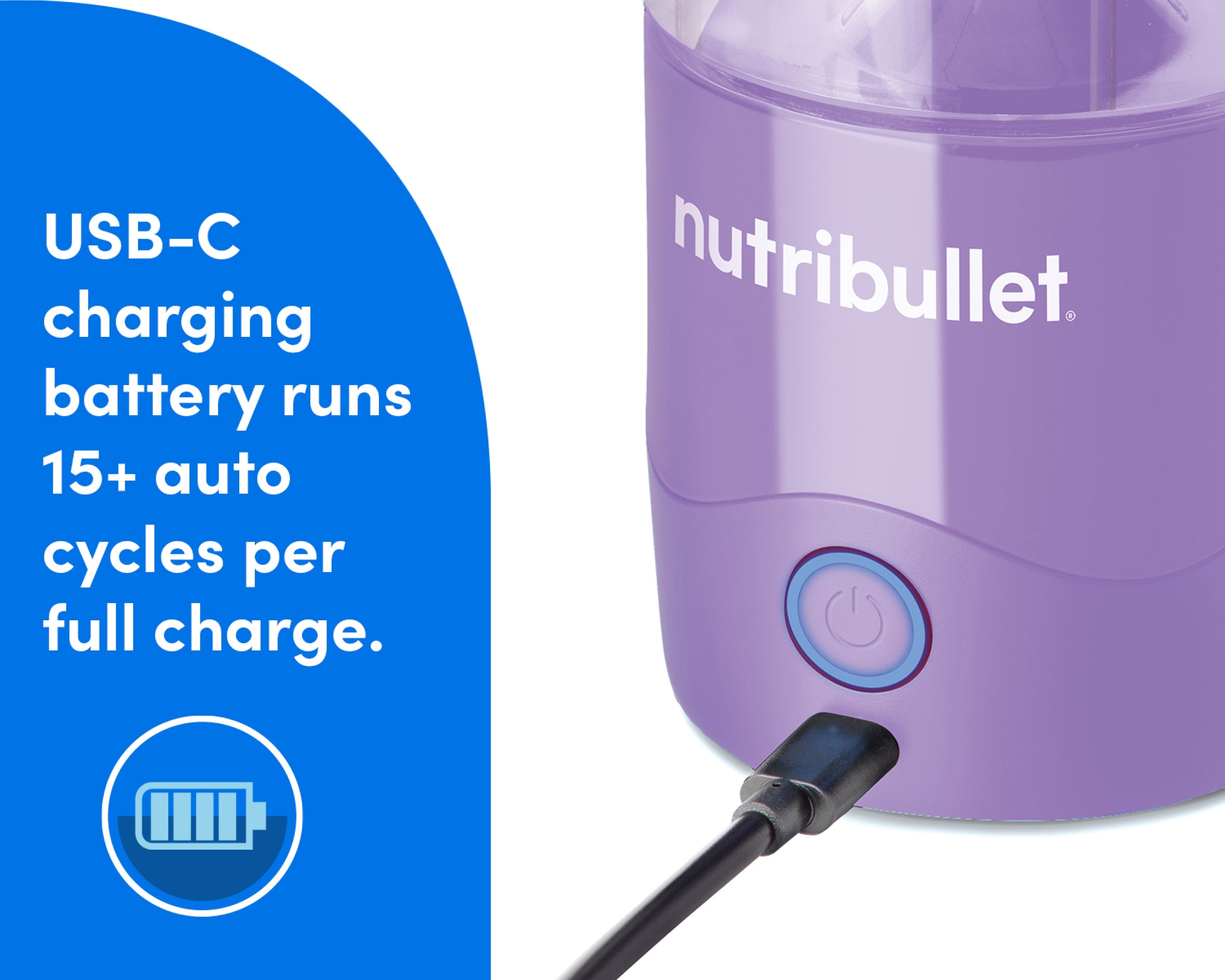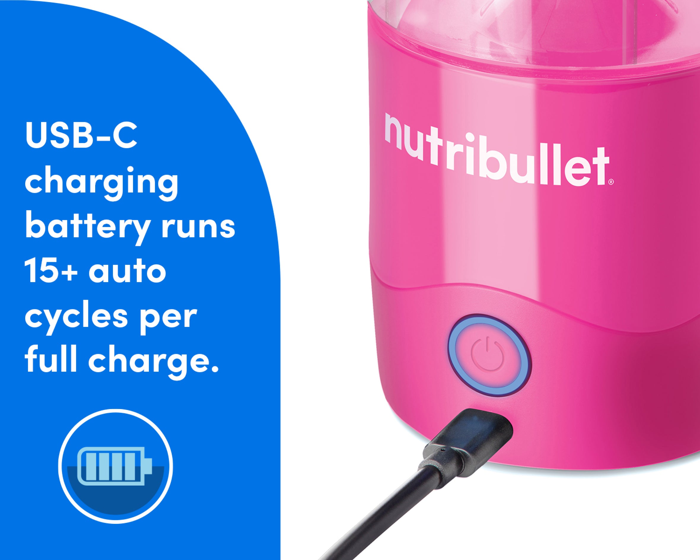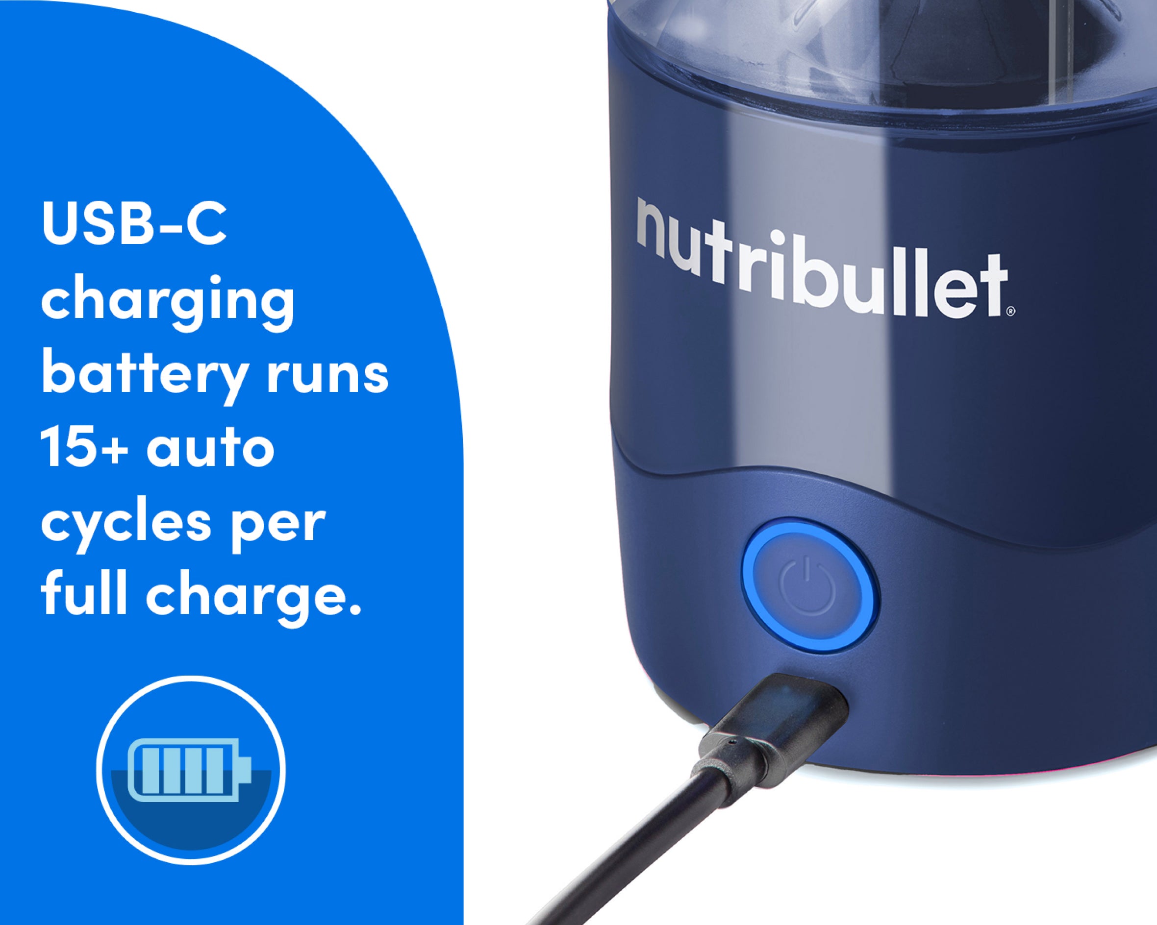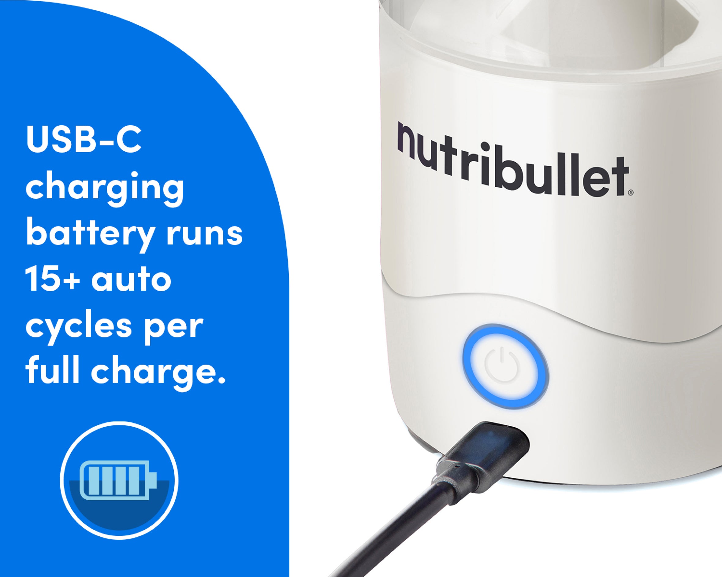 The rechargeable USB-C battery holds 15+ blend cycles when fully charged.
